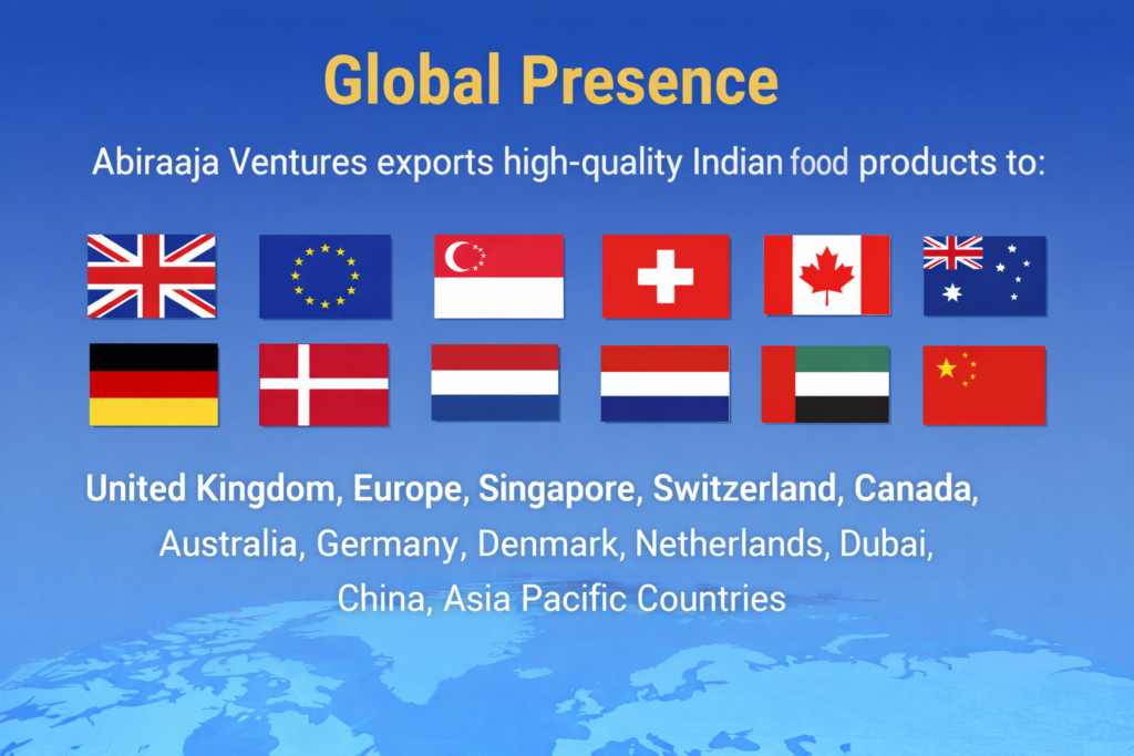 Abiraaja Ventures Private Limited is a leading Indian food export company based in Chennai, Tamil Nadu, established in 2015. We specialize in sourcing, processing, packaging, and exporting premium quality Indian food products to international markets.
